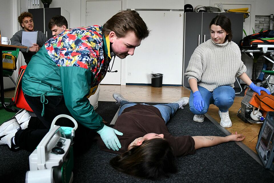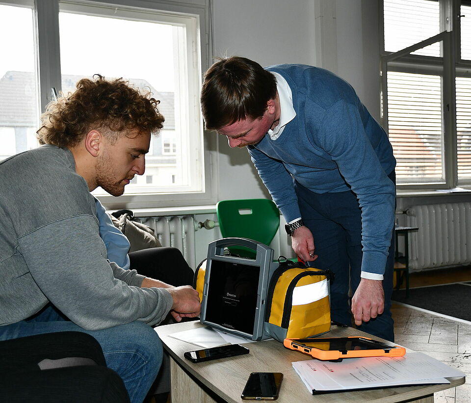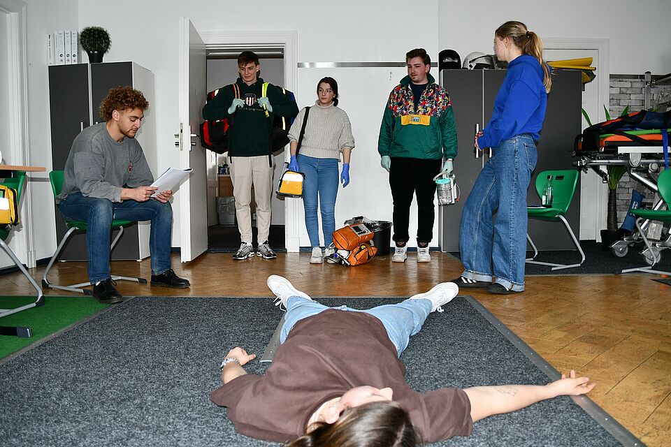 An Praxistagen simulieren die Auszubildenden mit einer Lehrkraft regelmäßig praktische Einsätze. In Kleingruppen wechseln sich die Teilnehmenden dabei ab.