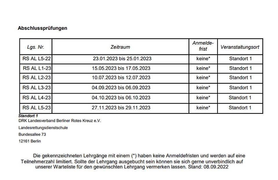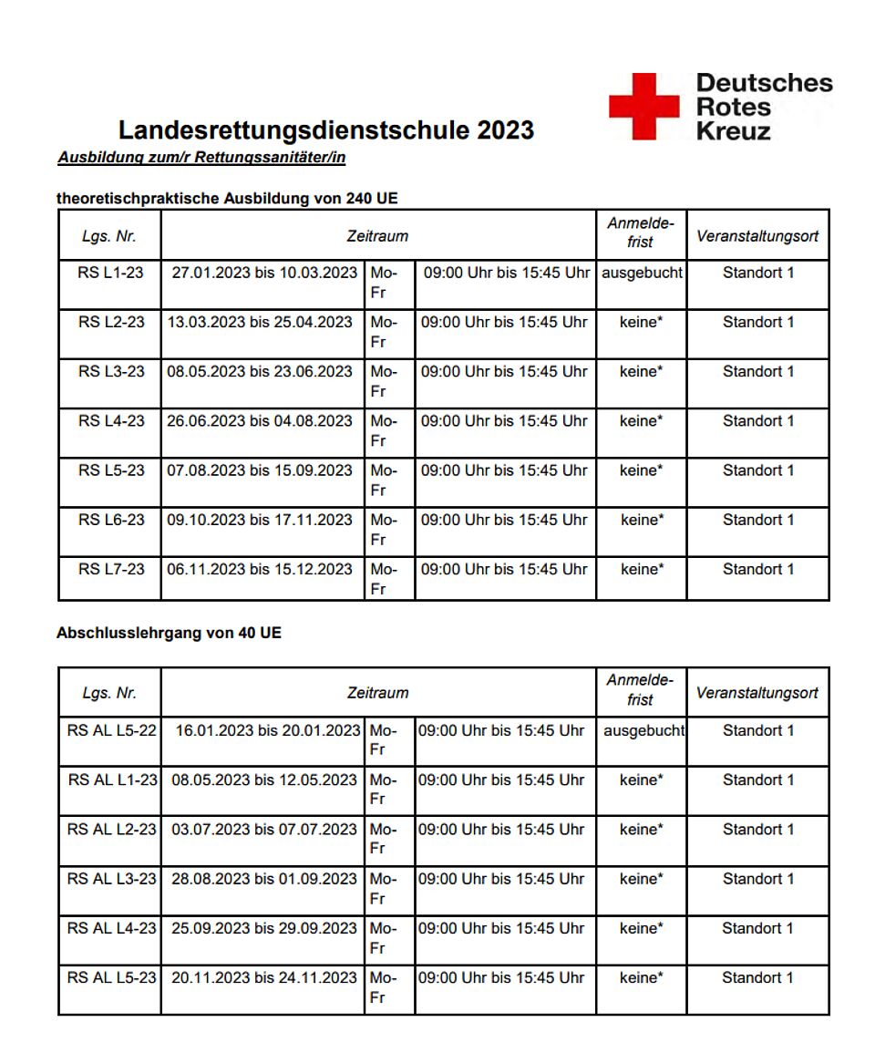 Danach belegen Sie einen Platz in einem der aufgeführten Abschlusslehrgänge und legen im Anschluss Ihre Prüfung zum/r Rettungssanitäter/in ab. Für die gesamte Aus- und Weiterbildung steht Ihnen ein Zeitraum von zwei Jahren zur Verfügung.